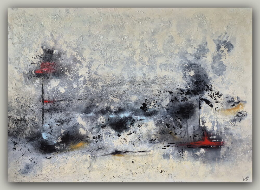 Das abstrakte Gemälde lässt eine Landschaft im Sturm erahnen. Der grau/beige Hintergrund wird durch einzelne farbige Elemente spannend gehalten. Die Seiten des Bildes sind als dunkelgrauer Galerierahmen gestaltet. Das Bild ist mit Zackenaufhängern versehen und fertig zum Hängen.